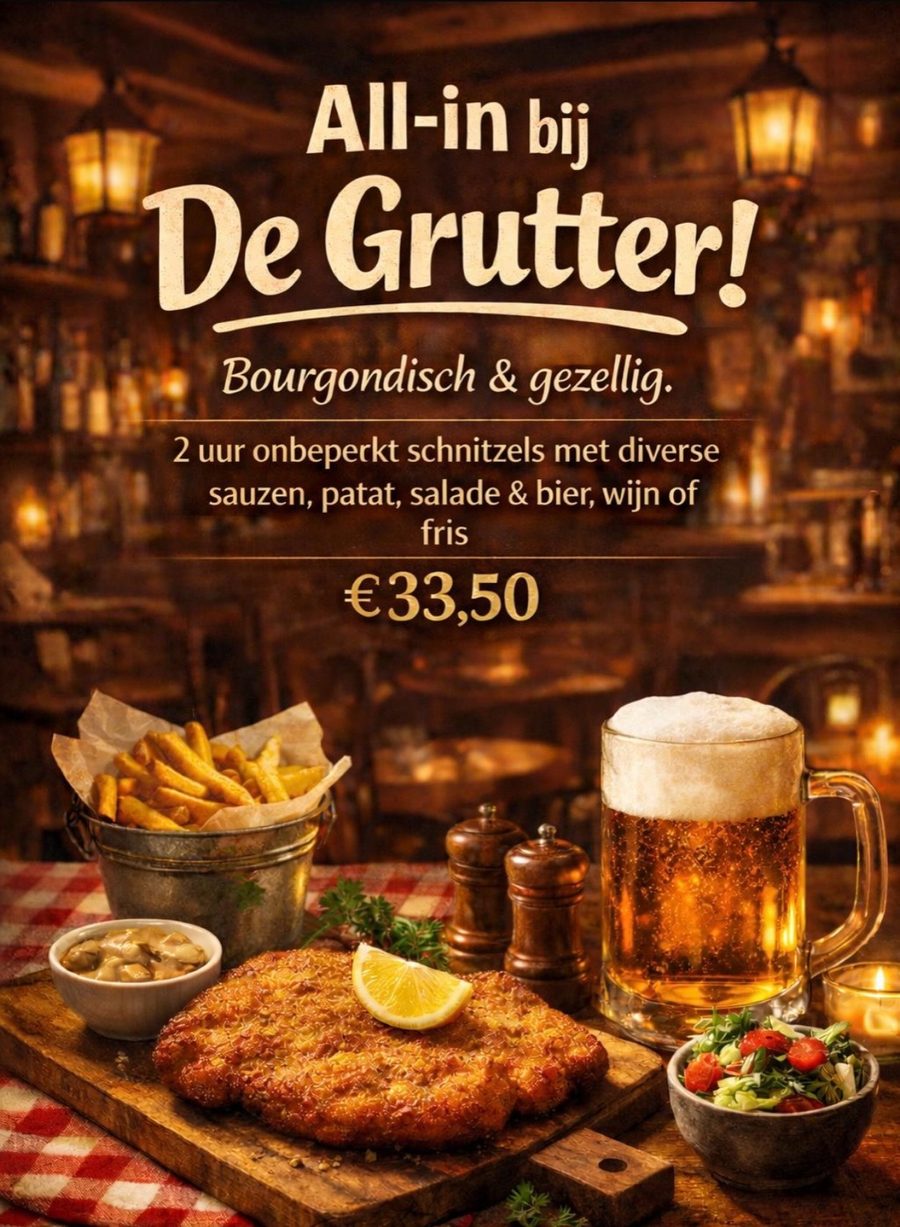 Laat u verrassen door onze heerlijke all-in deal. Voor slechts €33,50 geniet u 2 uur lang onbeperkt van heerlijke schnitzels, verse salade en knapperige patat, geserveerd met een ruime keuze aan smaakvolle sauzen. Daarbij zijn bier, wijn en frisdrank inbegrepen. All-in bij De Grutter in Annen!